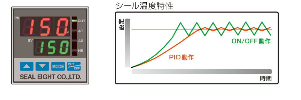下側の熱板サイズを長くして熱板上で圧着することにより、従来よりも低温度でのシール作業を実現しました。また、PID制御での安定した温度制御との相乗効果により、高スピードでの安定したシール作業環境をご提供いたします。